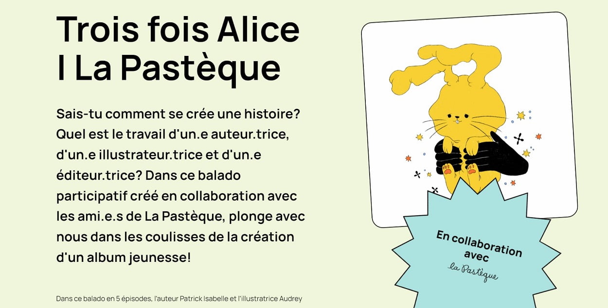Dans ce balado en 5 épisodes, l’auteur Patrick Isabelle et l’illustratrice Audrey Malo travaillent ensemble pour créer de toutes pièces un album illustré. Tout au long de cette aventure, la jeune Alice, amoureuse de littérature, vient mettre son grain de sel et poser toutes sortes de questions sur le pourquoi du comment de comment on fait ça, une histoire dessinée!